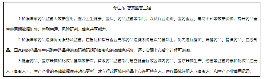 1.建立健全藥品信息化追溯體系。落實(shí)藥品上市許可持有人追溯主體責(zé)任。完善藥品信息化追溯體系,構(gòu)建國(guó)家藥品追溯協(xié)同服務(wù)和監(jiān)管體系,推進(jìn)藥品追溯信息互通共享,實(shí)現(xiàn)重點(diǎn)類別藥品全過程來(lái)源可溯、去向可追。逐步實(shí)施醫(yī)療器械唯一標(biāo)識(shí),完善醫(yī)療器械唯一標(biāo)識(shí)數(shù)據(jù)庫(kù),加強(qiáng)在上市后監(jiān)管、醫(yī)療管理、醫(yī)保管理等領(lǐng)域的銜接應(yīng)用。