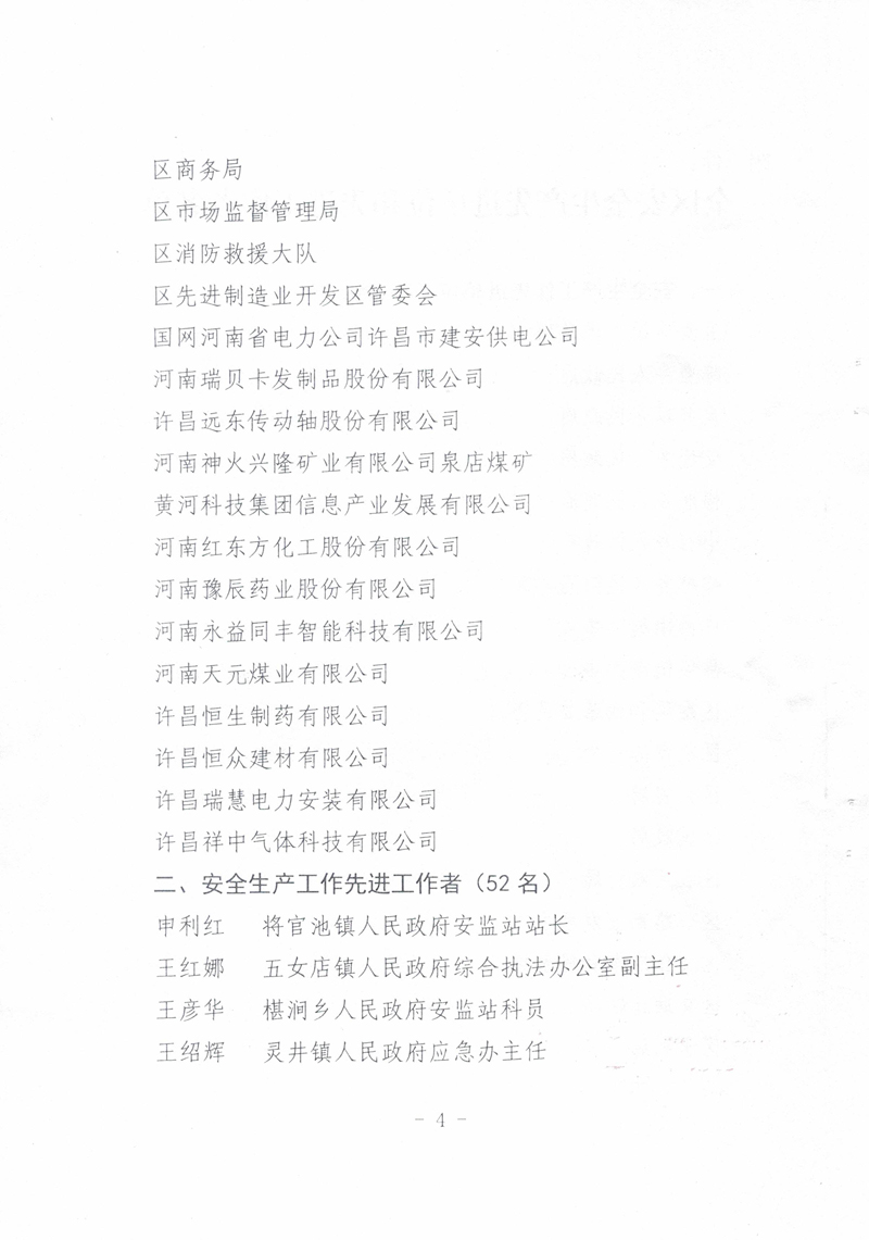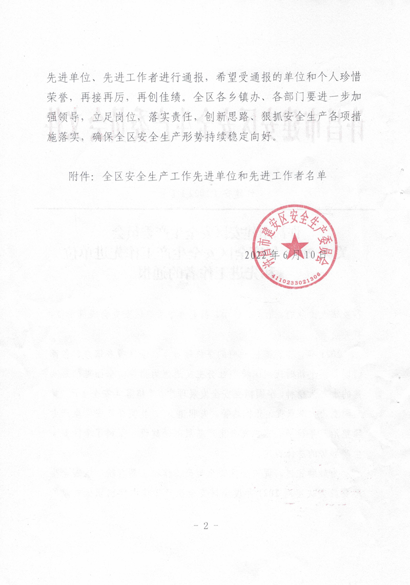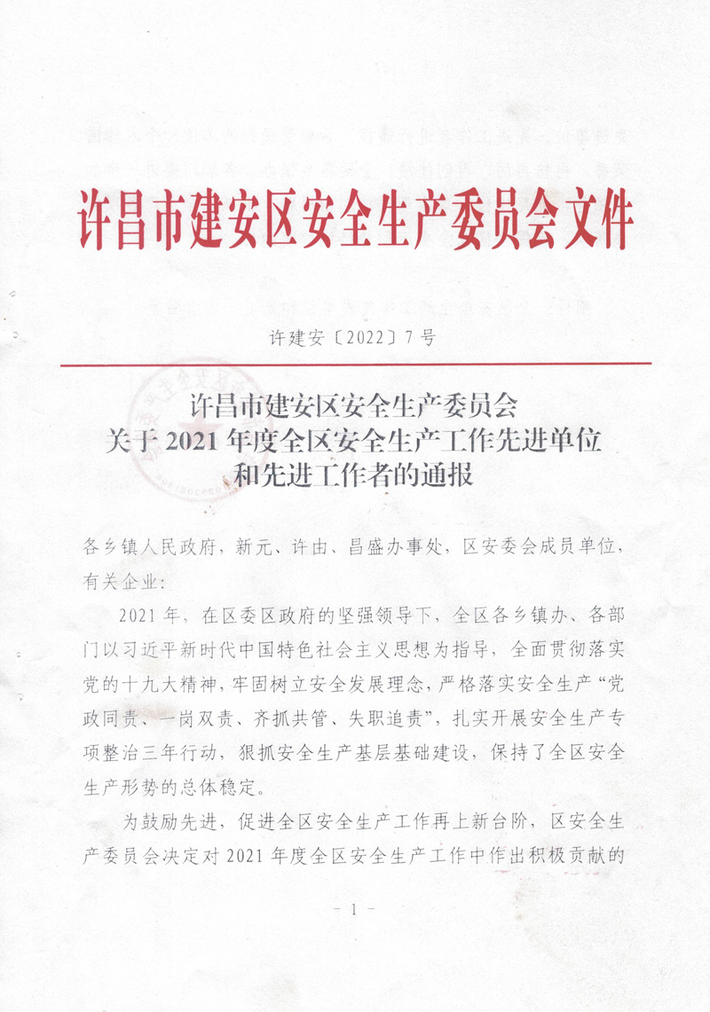 2021年,我公司以習(xí)近平新時代中國特色社會主義思想為指導(dǎo),全面貫徹落實黨的十九大精神,牢固樹立安全發(fā)展理念,嚴格落實安全生產(chǎn)“黨政同責(zé)、一崗雙責(zé)、齊抓共管、失職追責(zé)”,狠抓安全生產(chǎn)基層基礎(chǔ)建設(shè),排除潛在的安全隱患,保持了廠區(qū)安全生產(chǎn)形勢的總體穩(wěn)定。故許昌市建安區(qū)安全生產(chǎn)委員會對我公司在2021年度安全生產(chǎn)工作中的積極貢獻進行了表彰,授予于“全區(qū)安全生產(chǎn)工作先進單位”稱號。